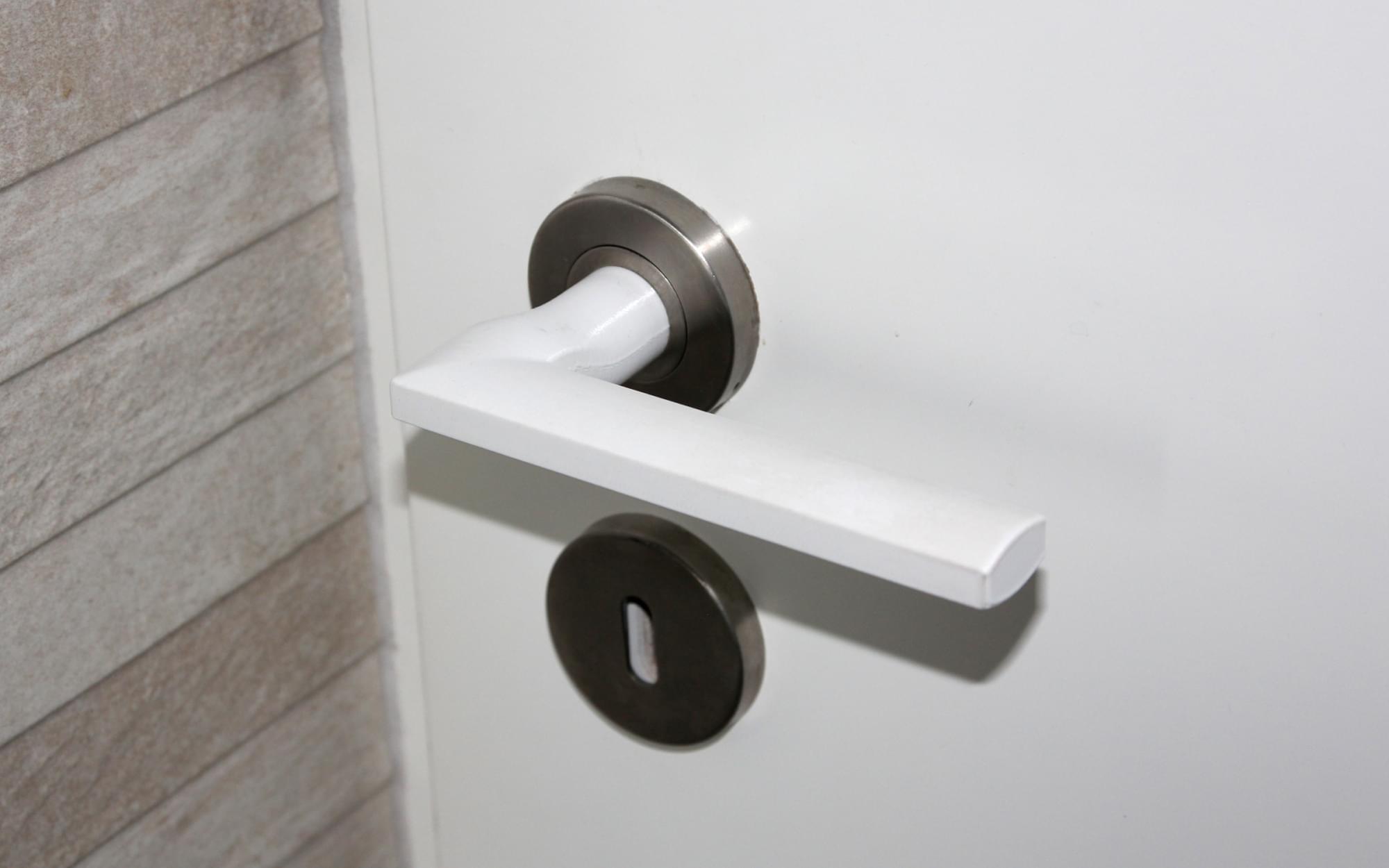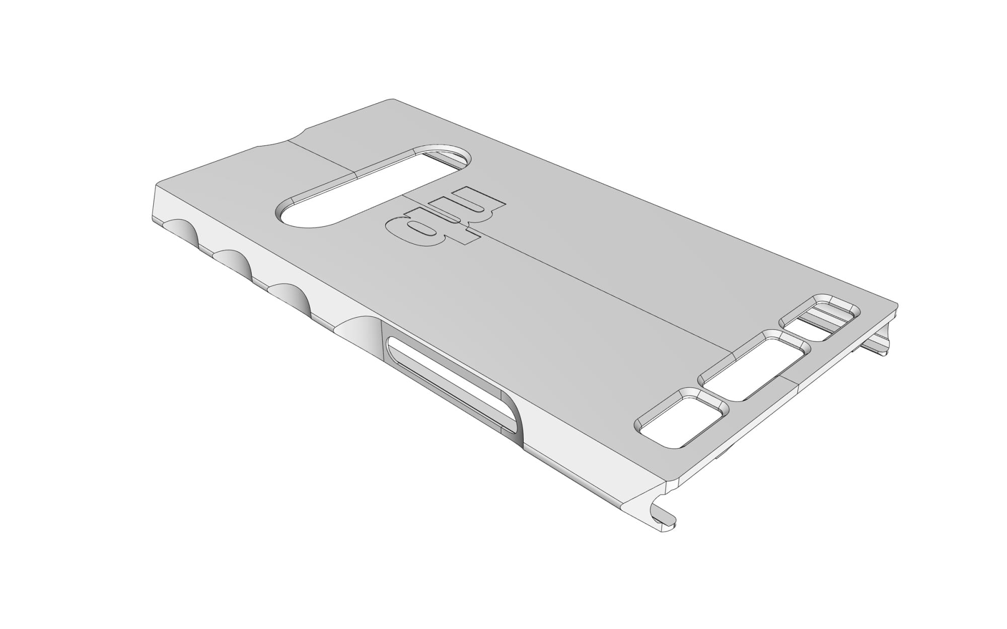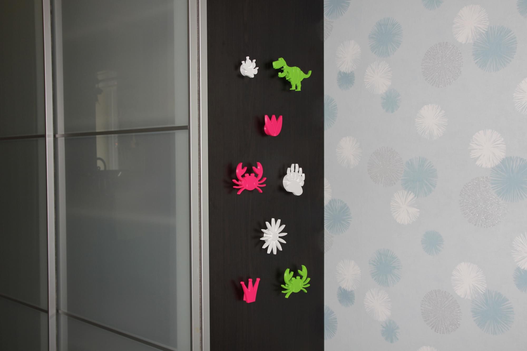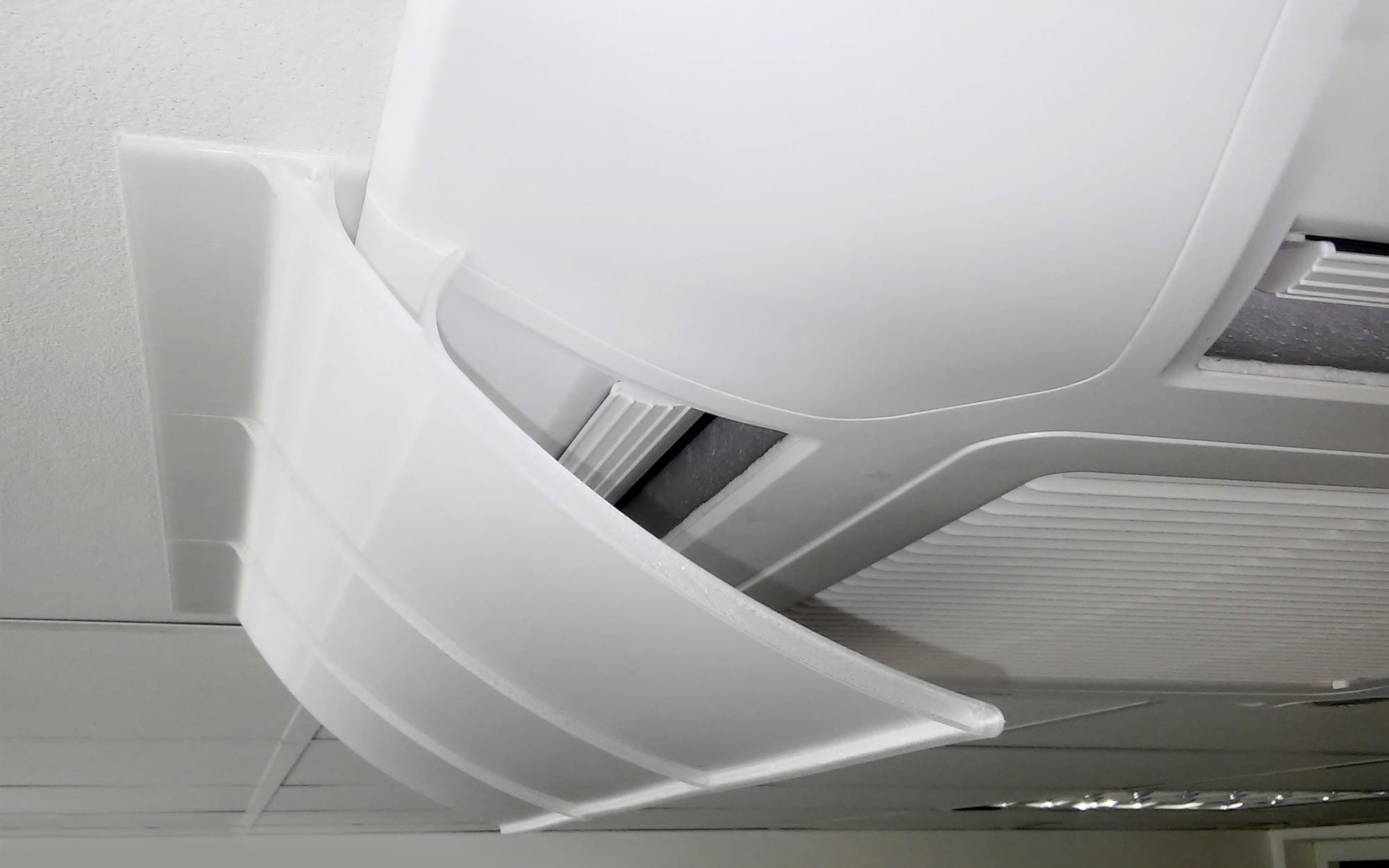 klika na míru tvarovaná tak, aby se vlezla mezi trubky topného žebříku a umožnila tak větší otevření dveří v malém prostoru, tisk z PET